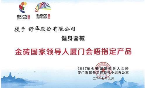 2017年,vsport体育健身器材入驻厦门金砖国家领导人会晤,并成为厦门金砖会晤指定健身器械。X6豪华智能家用跑步机荣获中国好设计金奖。 2017, Shuhua fitenss equipment presented itself in Xiamen as the designated fitness equipmentof Xiamen BRICS summit. X6 luxurious home use treadmill won gold award of China Good Design.
